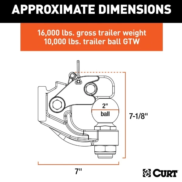 This particular CURT combination pintle and ball mounts features a ball capacity of 10,000 lbs. and a pintle capacity of 16,000 lbs. (NOTE: Never exceed the lowest weight capacity of any towing component; i.e. the vehicle, hitch, trailer, etc). It fits any lunette ring with a 2-1/2″ inside eye diameter and features a changeable 2″ trailer ball with a hard chrome finish. A safety pin and bolt kit are also included in this package.