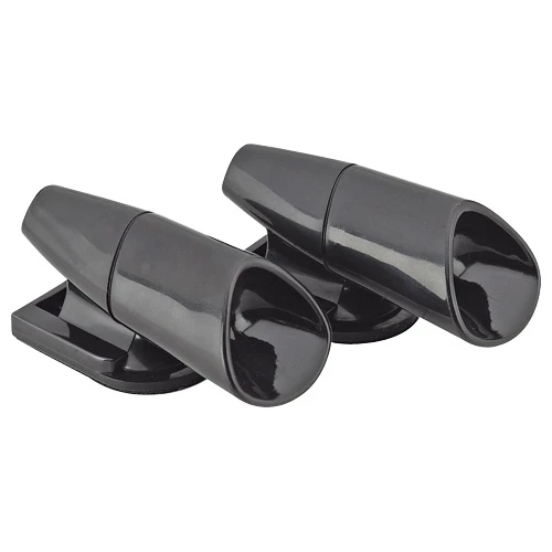 Pair of Bell deer warning black produces two separate and unique frequencies through air flow activation to protect those at high risk for vehicle-animal collisions.