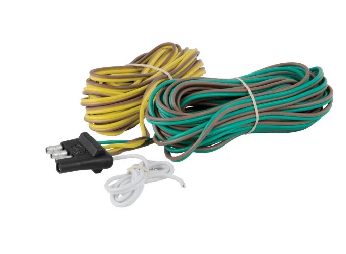 This 4-way flat connector is designed to supply power for tail lights, turn signals and brake lights, as well as a ground connection. It features durable rubber-molded construction and includes 20′ of standard color-coded bonded wire and all necessary installation hardware to easily splice into your trailer’s wiring system. This 4-way flat connector is a male-end plug, specifically designed for the trailer side of the connection. It is compatible with all 2-wire vehicle systems.