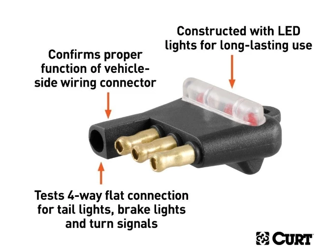 All CURT connector testers come with LED lights to be bright and long-lasting. Wire testers are available for 4-way flat, 5-way flat, 6-way round and 7-way RV blade connectors. This particular electrical tester fits a 4-way flat socket and comes with quality plastic construction.