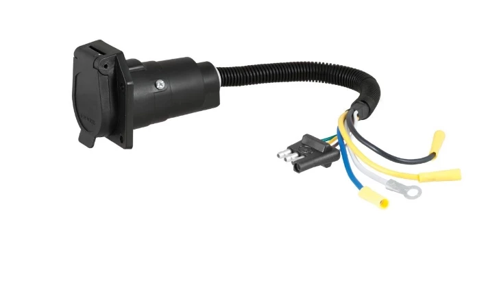 - Adapts a 4-way flat vehicle socket to fit 7-way RV blade trailer plugs