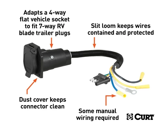 This electrical adapter is designed to adapt a 4-way flat vehicle socket to fit a 7-way RV blade trailer plug. It is constructed from quality plastic and requires some splicing. All CURT wiring and electrical products come with a one-year limited warranty to give you the assurance you need to tow with confidence.