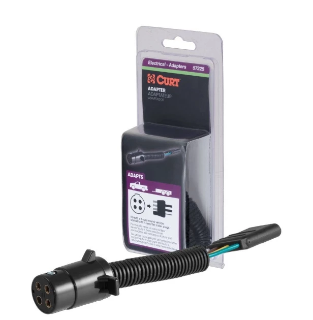 This electrical adapter is designed to adapt a 4-way round vehicle socket to fit a 4-way flat trailer plug. It features quality plastic construction and requires no splicing. All CURT wiring and electrical products come with a one-year limited warranty to give you the assurance you need to tow with confidence.