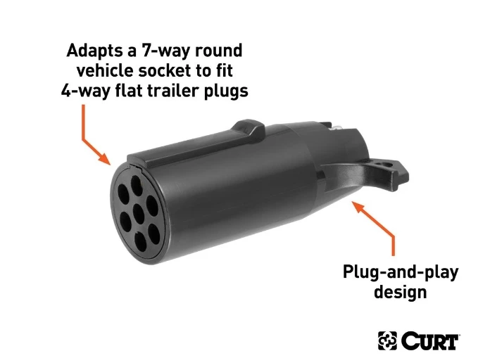 This electrical adapter is designed to adapt a 7-way round vehicle socket to fit a 4-way flat trailer plug. It is constructed from quality plastic and requires no splicing. All CURT wiring and electrical products come with a one-year limited warranty to give you the assurance you need to tow with confidence.