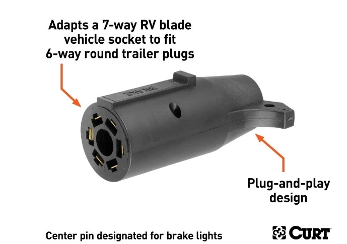 This electrical adapter is designed to adapt a 7-way RV blade vehicle socket to fit a 6-way round trailer plug (center pin for brake lights). It features quality plastic construction and requires no splicing. All CURT wiring and electrical products come with a one-year limited warranty to give you the assurance you need to tow with confidence.
