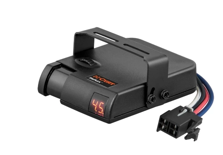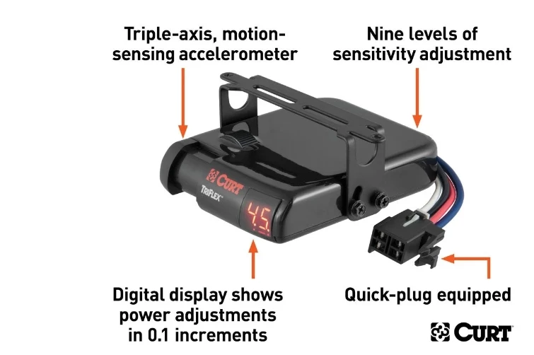The TriFlexβ’ proportion-based brake controller features a compact size, a digital display and the ability to manage up to eight brakes at a time. The feature that sets the TriFlexβ’ apart from many others is its triple-axis motion-sensing accelerometer. This integrated circuit component allows the TriFlexβ’ to detect every motion of your vehicle and trailer with exact precision and to then apply the perfect amount of braking power for every situation. The TriFlexβ’ also automatically adjusts brake output when going up or down a hill and is compatible with anti-lock brakes and cruise control. It comes with a mounting bracket and hardware and can be mounted at various angles on your vehicle’s dash. Best of all, like other CURT brake controls, the TriFlexβ’ is protected by a limited lifetime warranty.