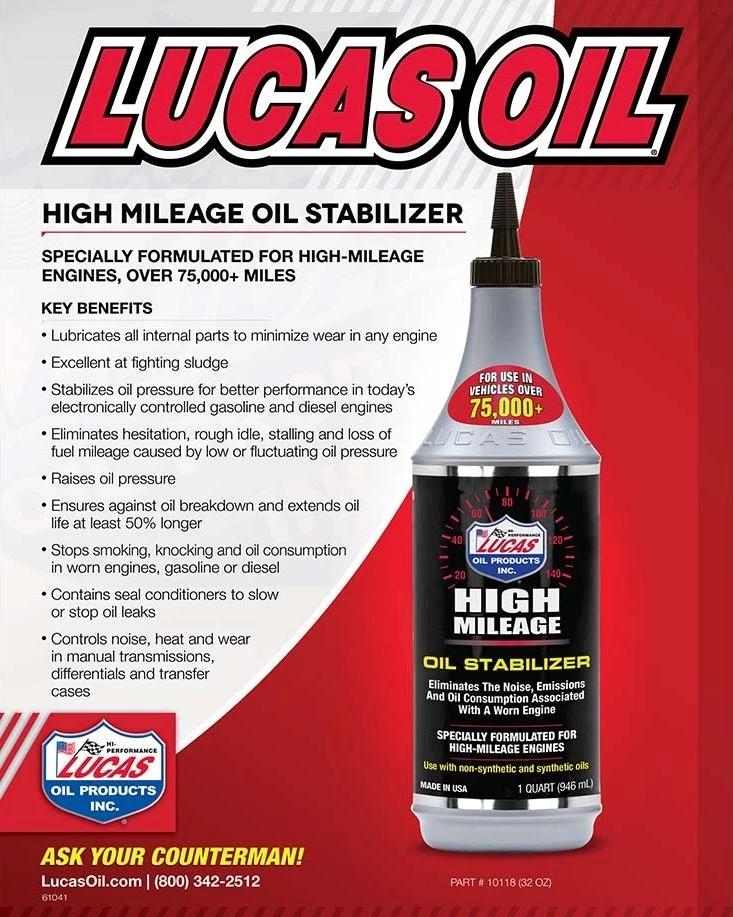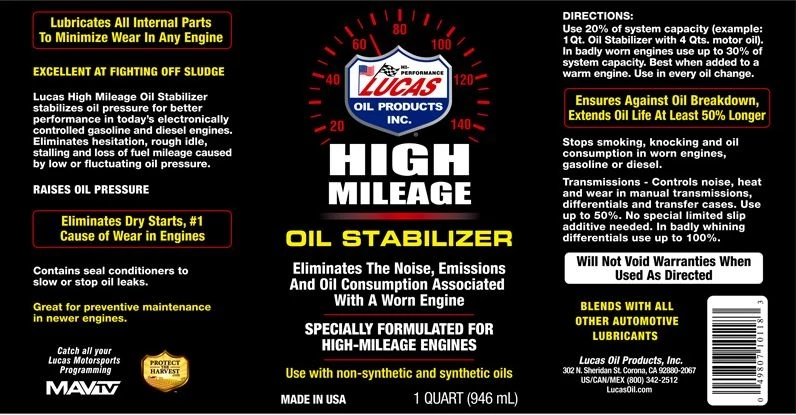 Maximum lubricity is achieved with a mix ratio of 20% Lucas High Mileage Oil Stabilizer to 80% engine / transmission oil. This mixture is much slicker than oil alone, reducing friction and heat to allow optimum mechanical efficiency. Lucas High Mileage Oil Stabilizer creates a coating that clings to metallic surfaces, eliminating dry starts that create the most damage and wear in an older engine. This product is for use in ALL engine-driven vehicles, and HIGHLY RECOMMENDED for recreational vehicles, farm equipment, industrial equipment as well as construction and military vehicles and equipment.