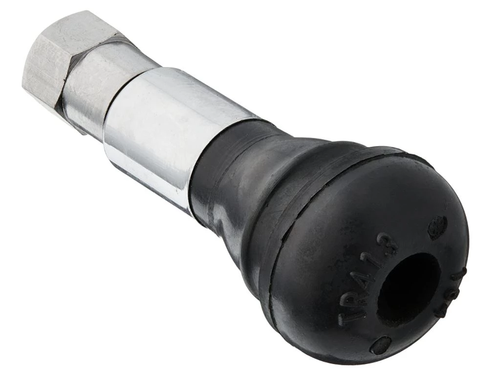 Two pack of 1 1/4″ chrome sleeve tubeless tire valves come with hex caps.