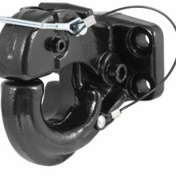 This heavy-duty pintle hook features a gross trailer weight capacity of 20,000 lbs. and a vertical load capacity of 4,000 lbs. (NOTE: Never exceed the lowest weight capacity of any towing component; i.e. the vehicle, hitch, trailer, etc). It fits any lunette ring with a 2-1/2″ or 3″ inside eye diameter and comes with a safety pin for a secure latch.