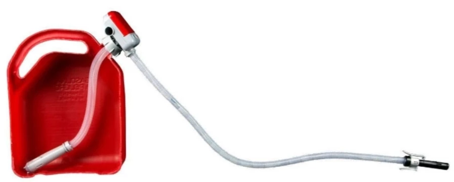 3 gallons per min / Requires 4 AA batteries (not included) / Flexible Intake hose / No-spill Auto-Stop Nozzle